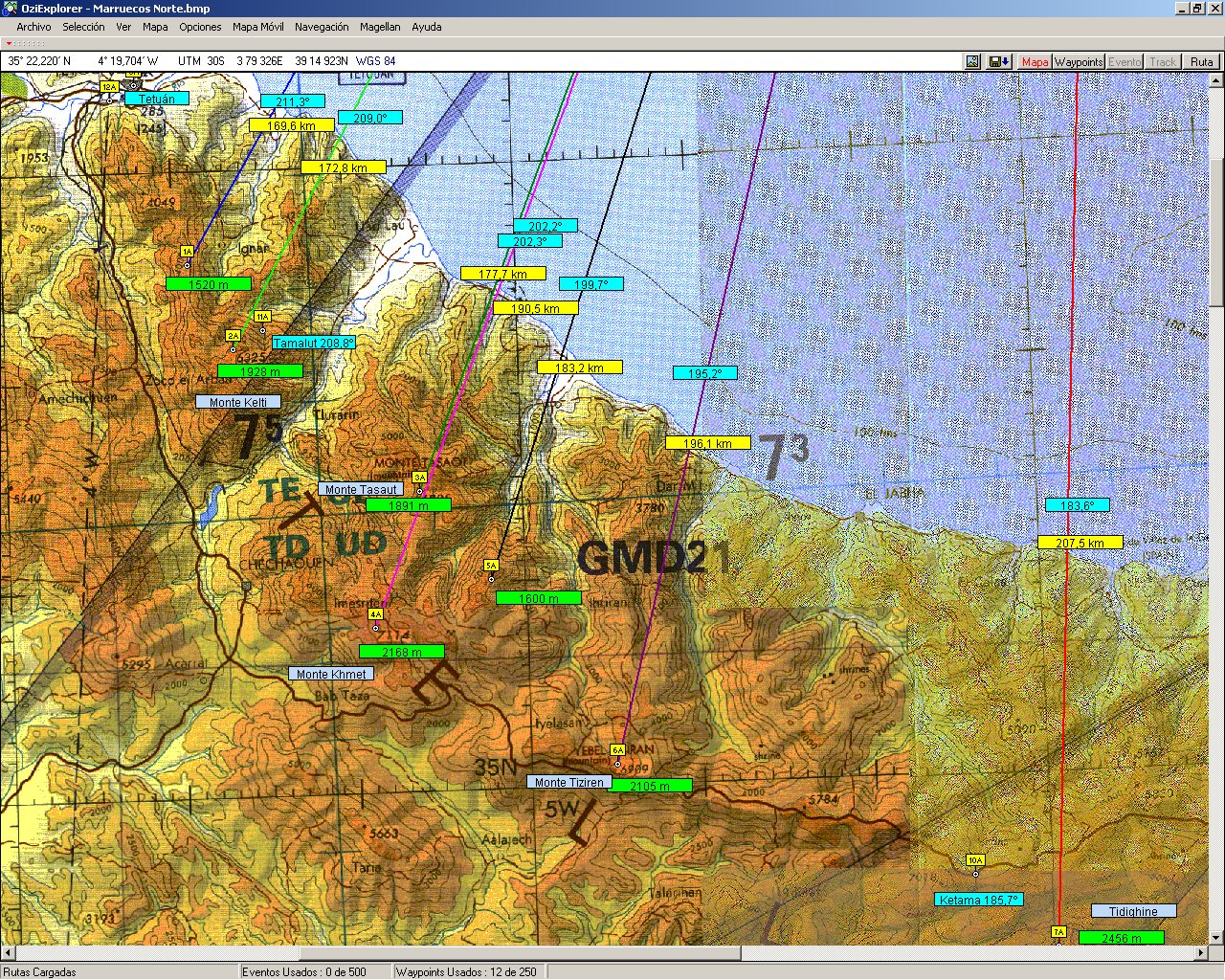 1928 metros de altitud. En la siguiente figura se ve al Kelti (con la etiqueta 2A, al centro, a la izquierda) en un mapa del norte de Marruecos, donde se han marcado algunos otros montes y lugares de interés, así como sus altitudes (verde), distancias a Málaga (amarillo), y azimuths (celeste)correspondientes a mi punto de observación.